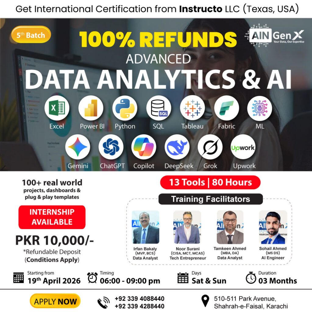 Advanced Data Analytics & AI turns scattered data into confident decisions. In this program, you’ll master Excel (Intermediate–Advanced) with Power Query and Power Pivot, then model and visualize in Power BI using DAX and M. You’ll explore Tableau for rapid insights and Microsoft Fabric for streamlined data automation. Build rock-solid foundations with SQL across MySQL and PostgreSQL. Move into Python for Data Analysis, and apply Machine Learning and AI to real business problems. We’ll also cover Upwork essentials to monetize your skills. Finally, go prompts-to-production using Gemini, ChatGPT, DeepSeek, Grok, and Copilot—shipping reliable, cost-aware AI workflows end to end today.
